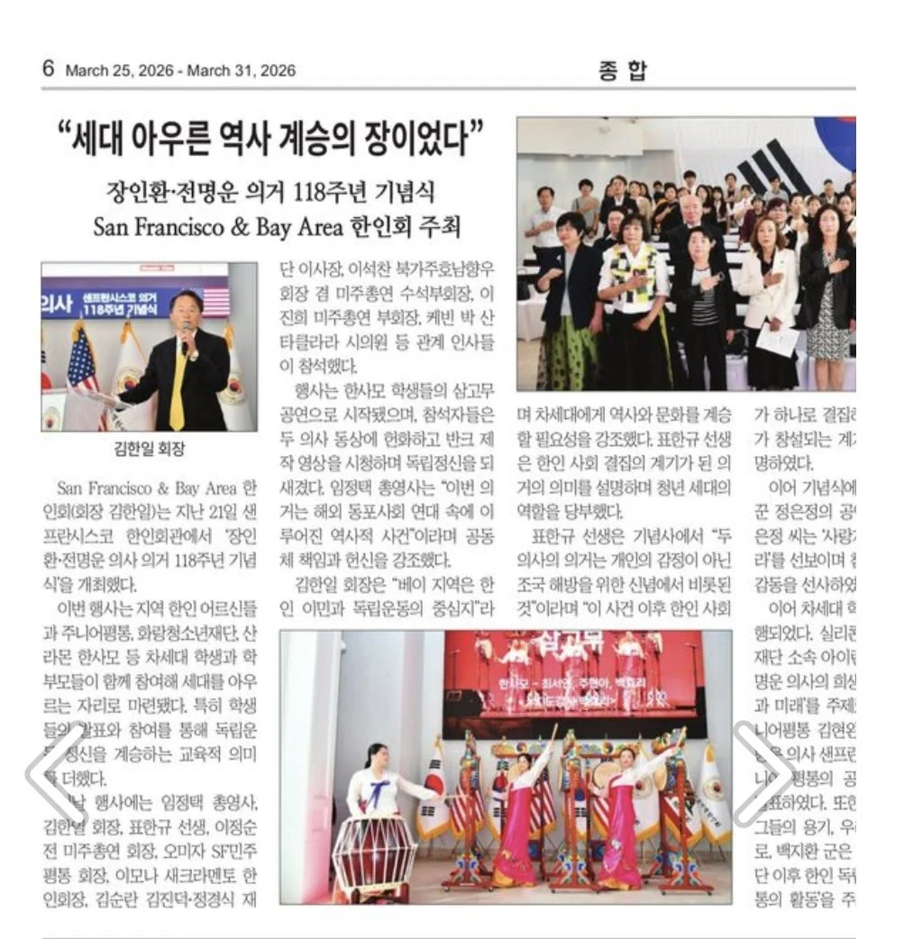 On March 21, the San Francisco & Bay Area Korea Center hosted a ceremony to commemorate the 118th anniversary of the historic act by Patriots Jang In-hwan and Jeon Myeong-un. Jointly organized by the Consulate General of the Republic of Korea in San Francisco and the Korea Center, the event honored the sacrifice of these two independence activists and aimed to pass their spirit on to the next generation.